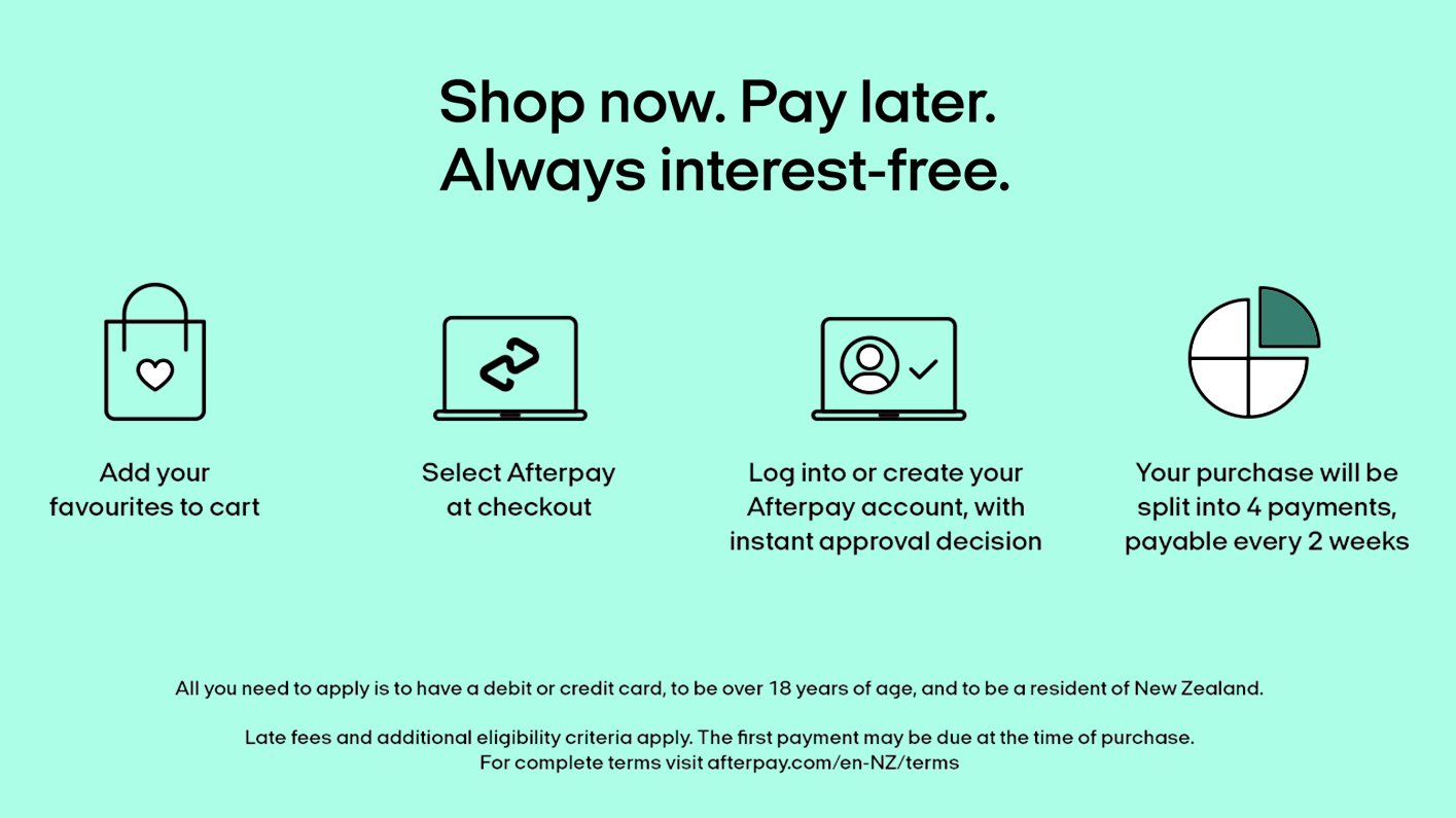 - For full Afterpay Terms and Conditions please visit the Afterpay website here.
