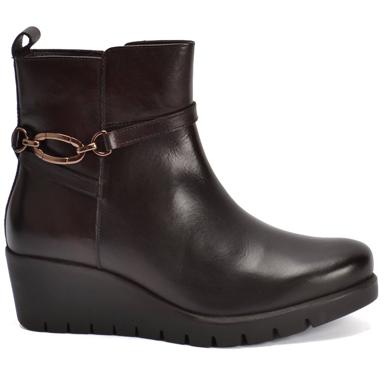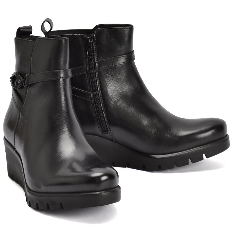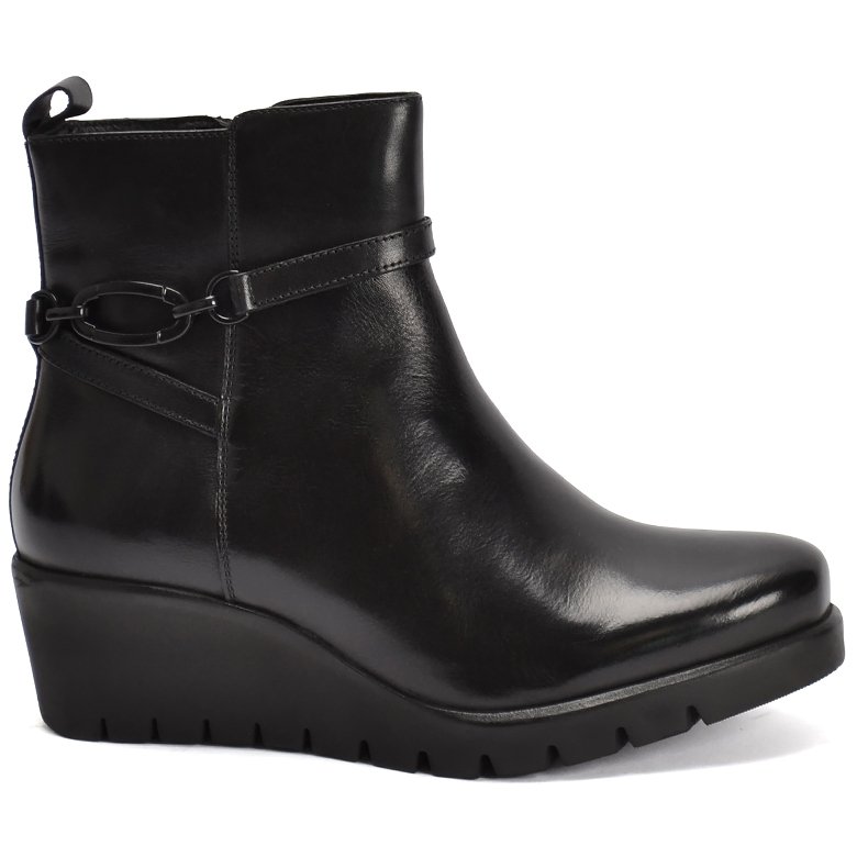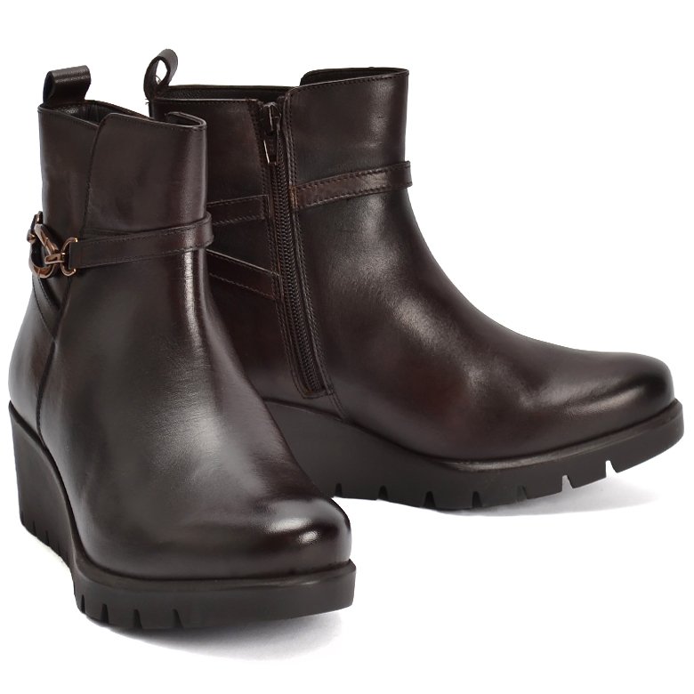 Mid wedge platform leather ankle boot with decorative buckle detail, plush velveteen lining, convenient inside zip and pull tab for ease of entry. Features removable Memory Foam insoles that can be replaced with an orthotic and rubber soles.