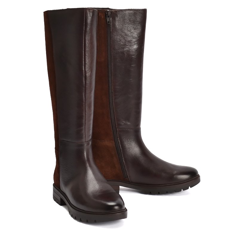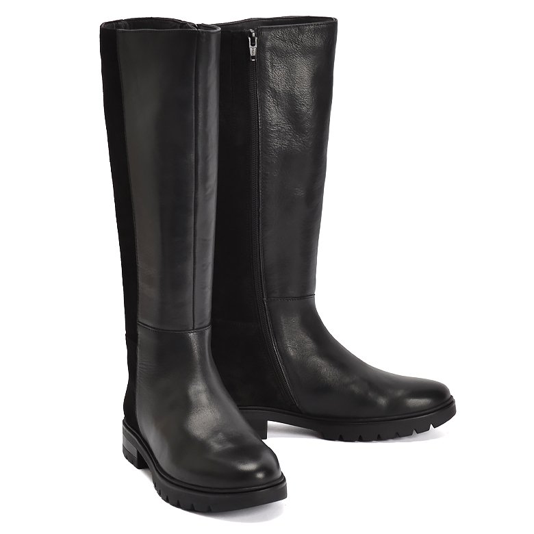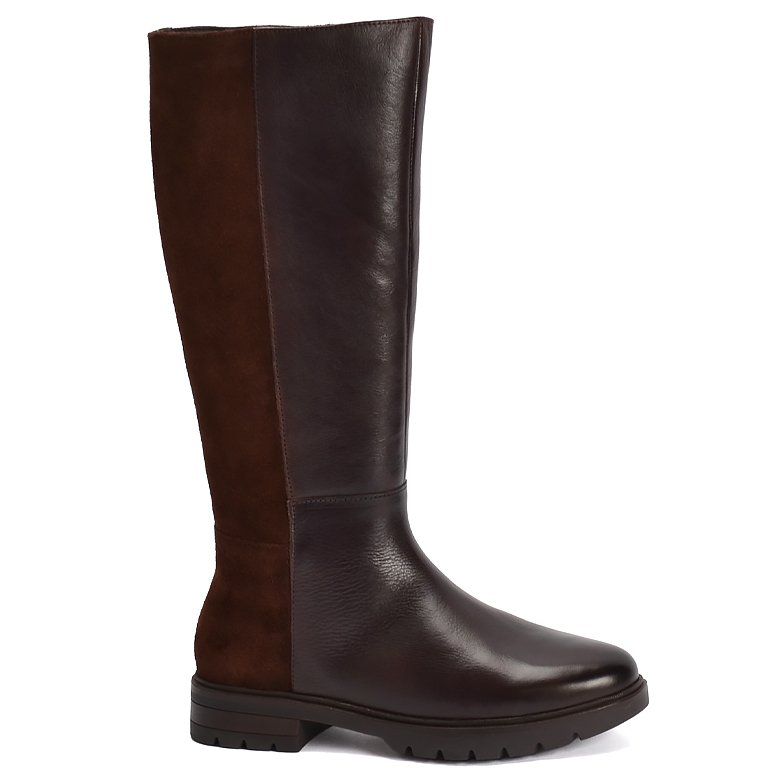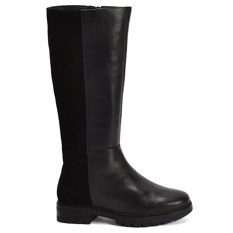 Low heel knee-length leather boot with convenient inside zip for ease of entry. Features suede leather on the back of the boot, comfortable rubber soles, soft velveteen lining and removable Memory Foam insoles.