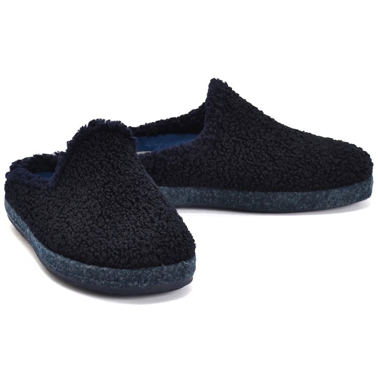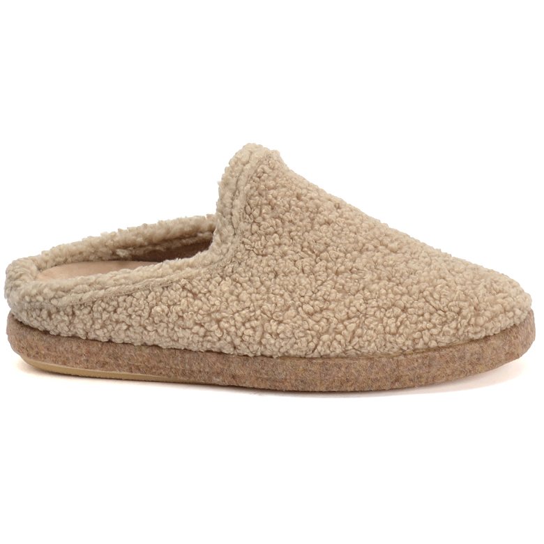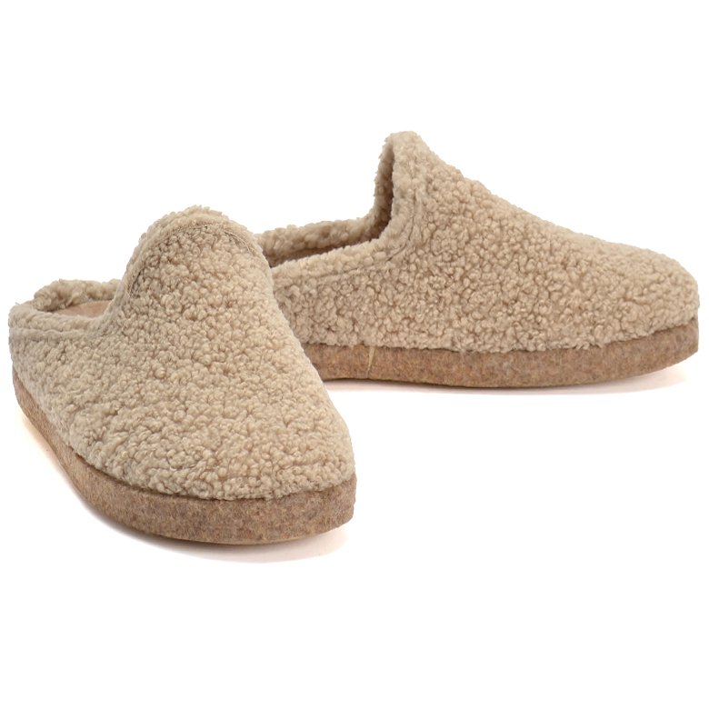 Slip-on clog style slipper with textured fluffy wool felt upper and lining, inbuilt arch support, rubber soles and removable padded insoles that can be replaced with an orthotic.