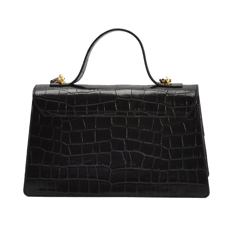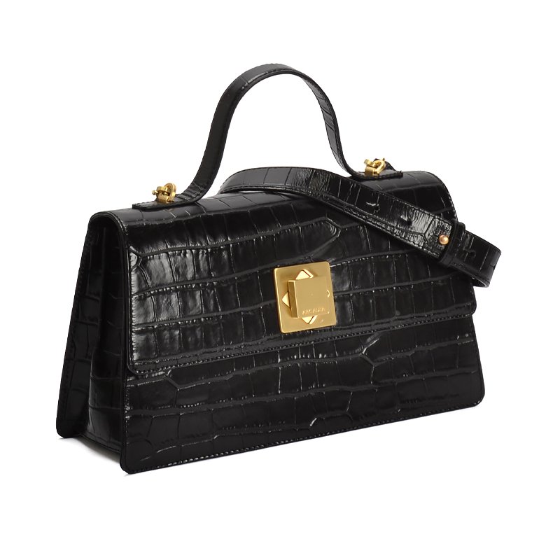 Small to medium sized exquisite structured leather handbag featuring brushed gold hardware, unique turn lock closure, removable and adjustable shoulder strap and drop handle for comfort.