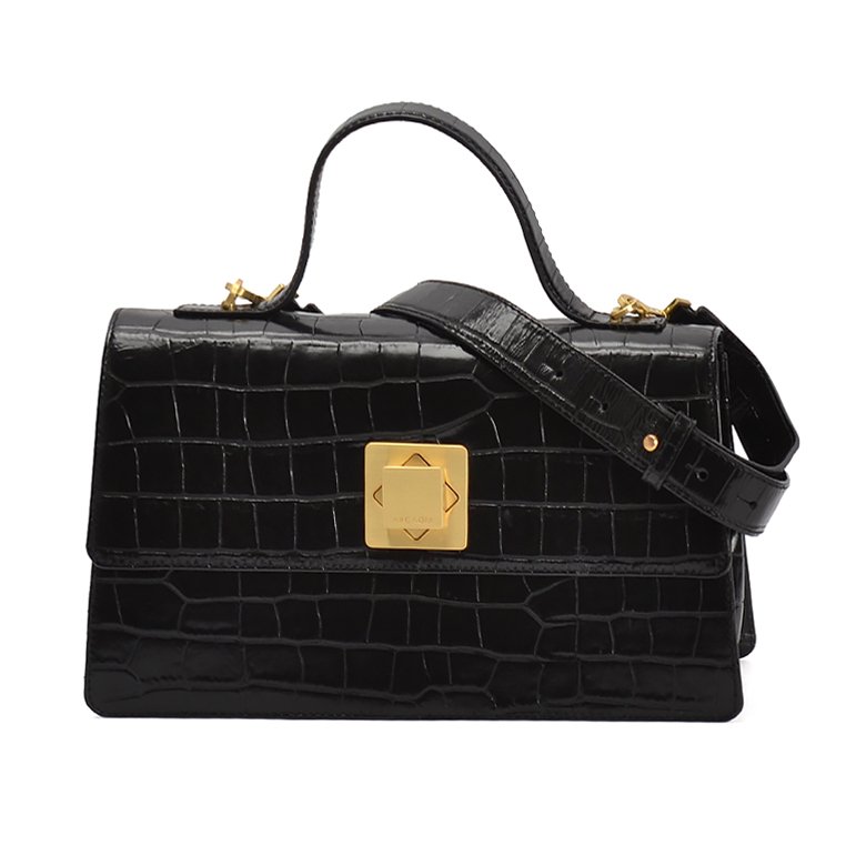 Small to medium sized exquisite structured leather handbag featuring brushed gold hardware, unique turn lock closure, removable and adjustable shoulder strap and drop handle for comfort.