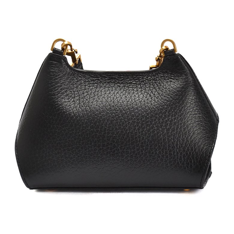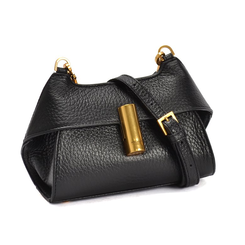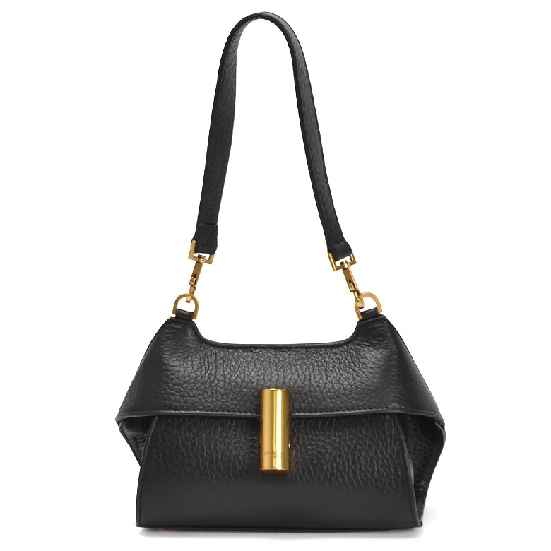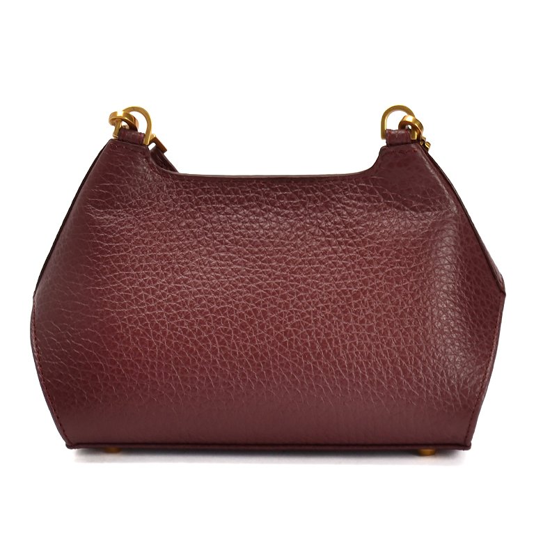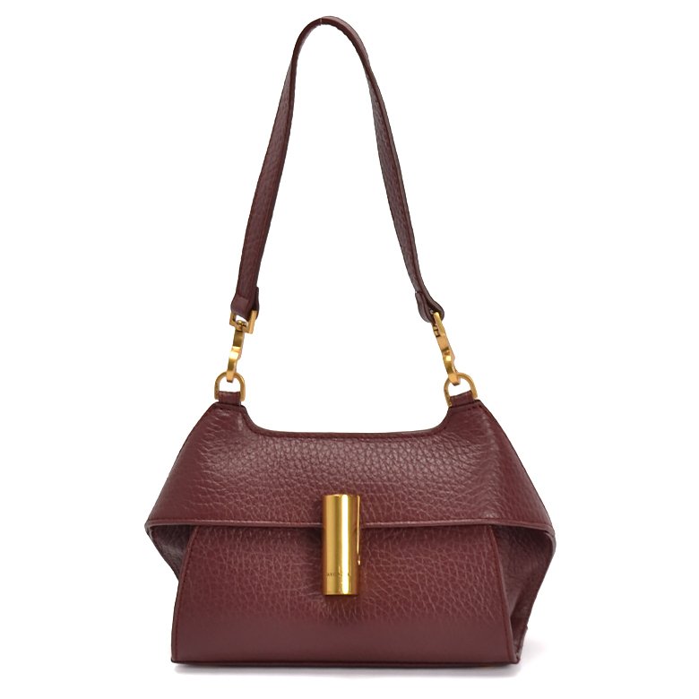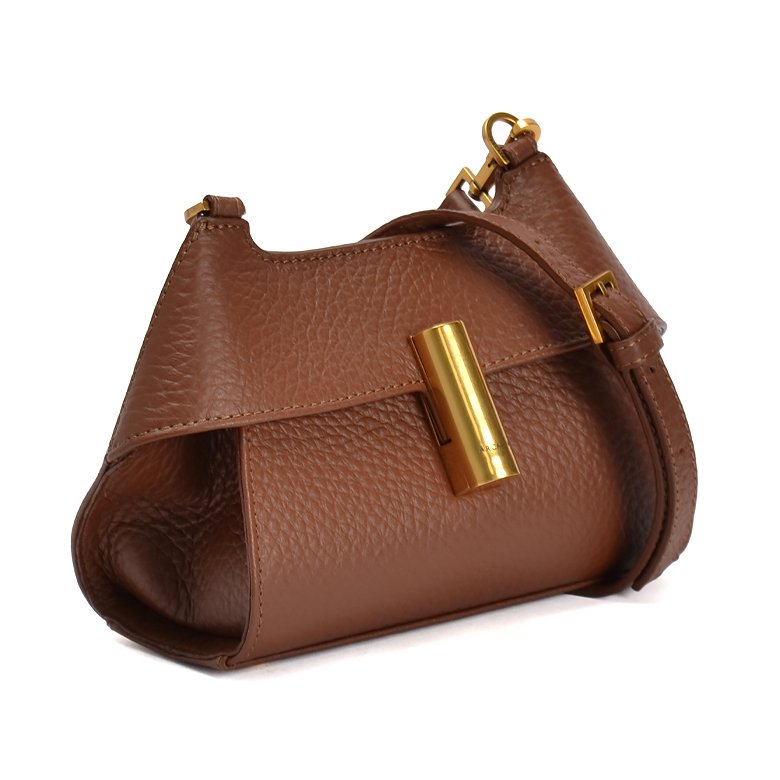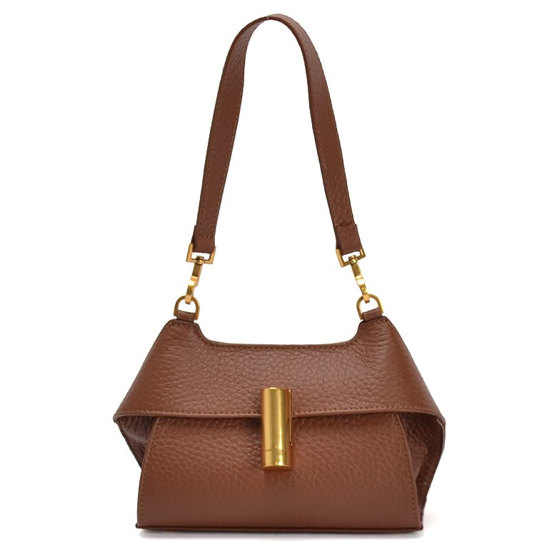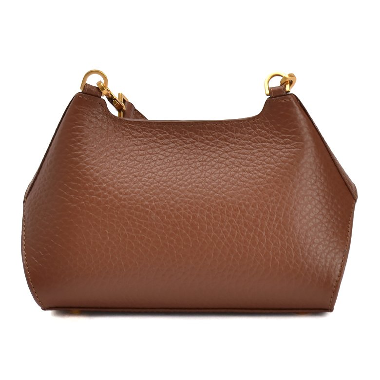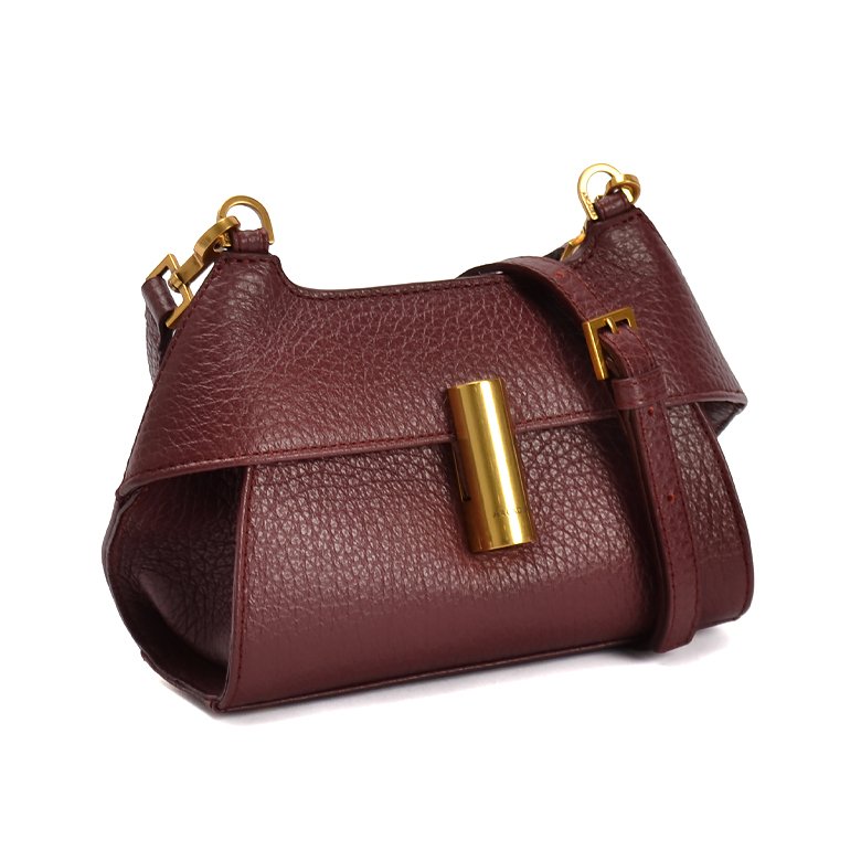 Small size exquisite structured leather handbag featuring detachable and adjustable shoulder strap, brushed gold hardware and unique turn lock closure.