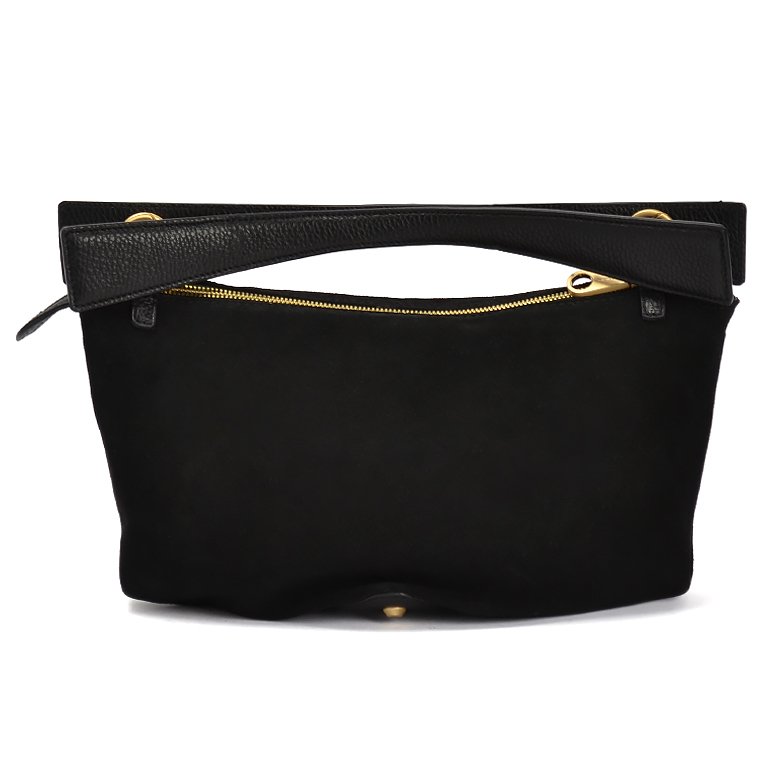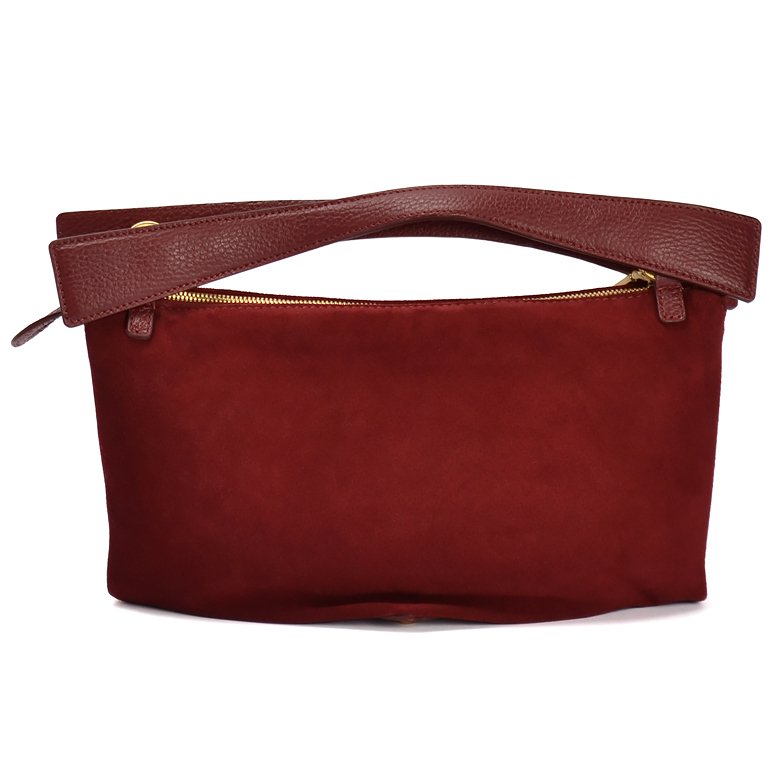 Small sized chic baguette style suede and soft grain leather handbag featuring double leather handles for comfort, detachable and adjustable shoulder strap and brushed gold hardware.