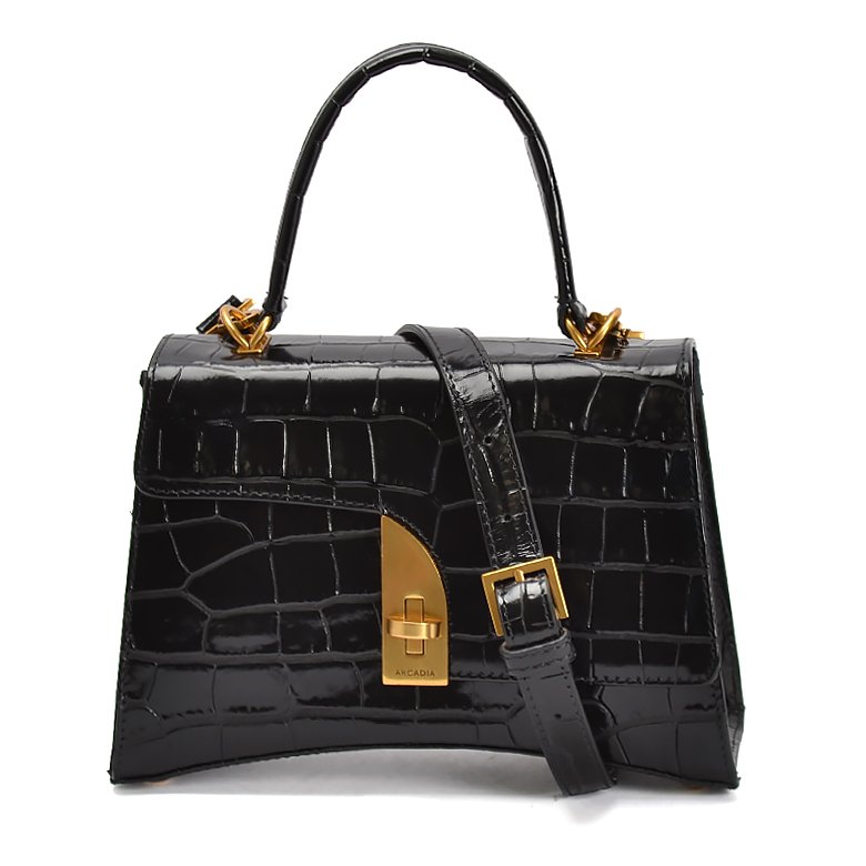 Small size exquisite structured leather handbag featuring unique turn lock closure, detachable and adjustable shoulder strap, polished brass tone hardware and Arcadia Branded textile lining.