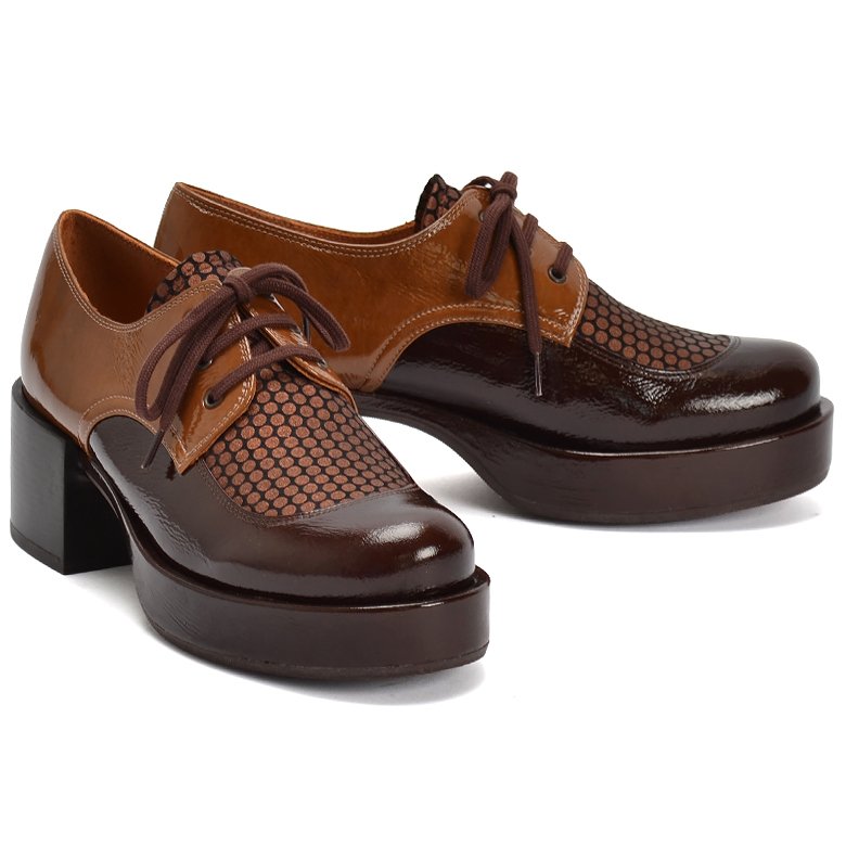 Mid height platform two-toned patent leather lace up shoe with rounded toe. Features contrast panel detailing across the vamp of the shoe with a chic polka dot metallic print.