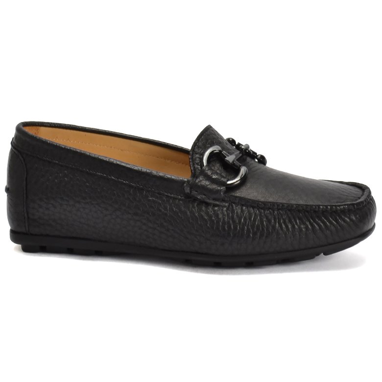 Low heel lightweight slip-on leather moccasin with metal buckle detail and arch support.