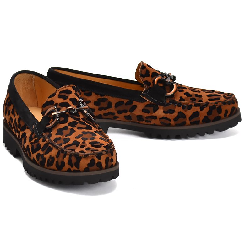 Low heel suede leather slip-on loafer style shoe with arch support and chic black and antique bronze coloured buckle detail. The leopard print design features elegant flocked velveteen finish on the suede leather.