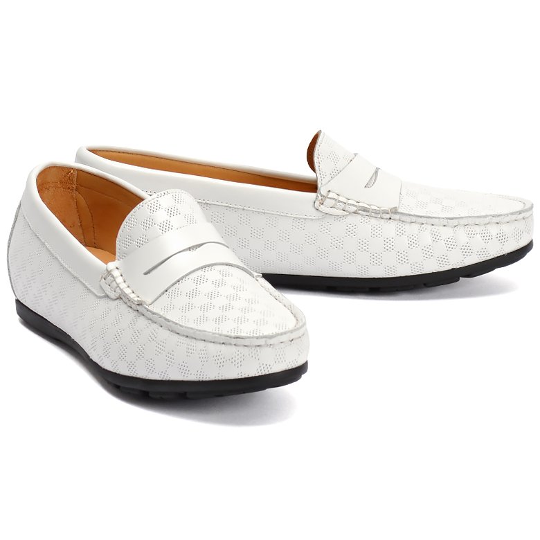 Low heel leather slip-on moccasin featuring chic checkered embossed detailing on the upper and slight arch support.