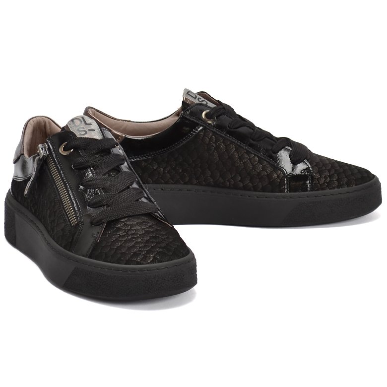 Features luxurious metallic printed suede leather detailing on the upper and a removable insole that can be replaced with an orthotic.