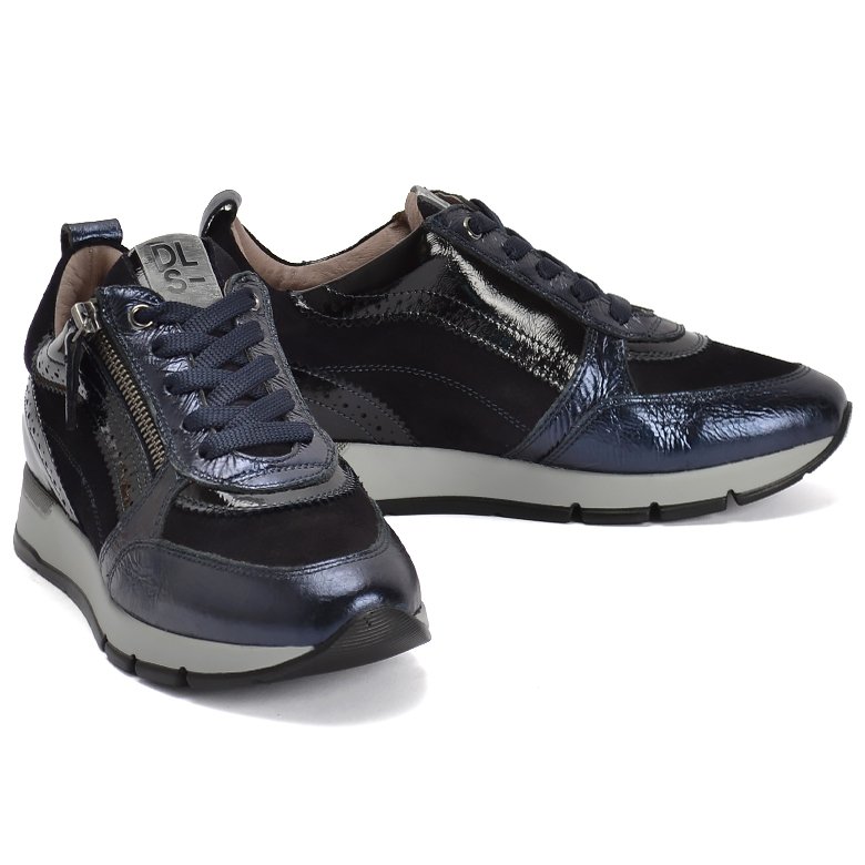 Low platform wedge multi leather lace up shoe with arch support and a convenient outside zip and pull tab for ease of entry.