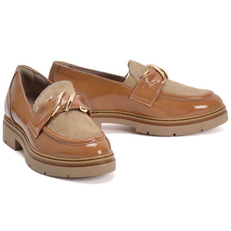 Low heel high shine patent leather slip-on loafer style shoe. Features hair-on detailing on the upper apron and chic gold coloured buckle detailing.