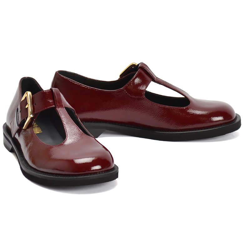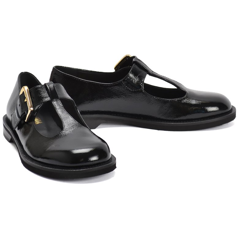 Low heel patent leather T-bar style shoe with an adjustable gold coloured buckle closure side strap for the ideal fit.