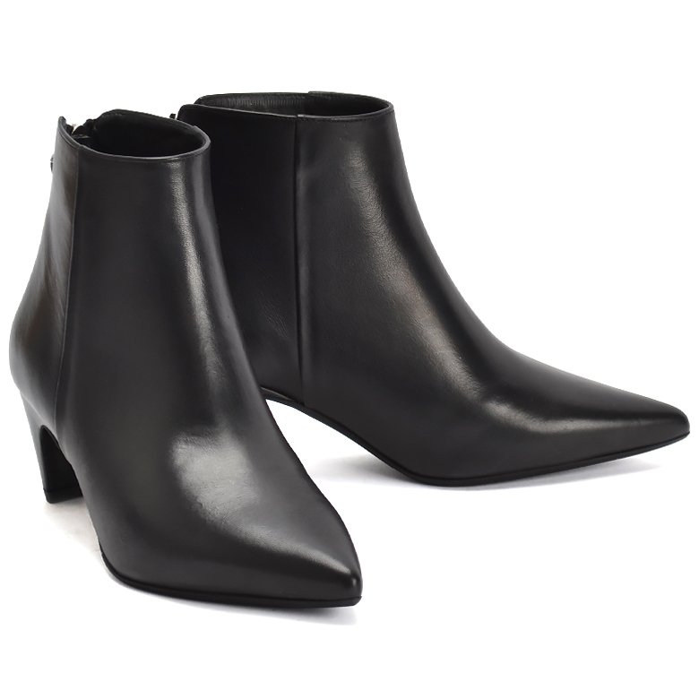 High heel leather ankle boot with convenient back zip for ease of entry, elegant pointed toe and tapered block heel for elegant comfort.