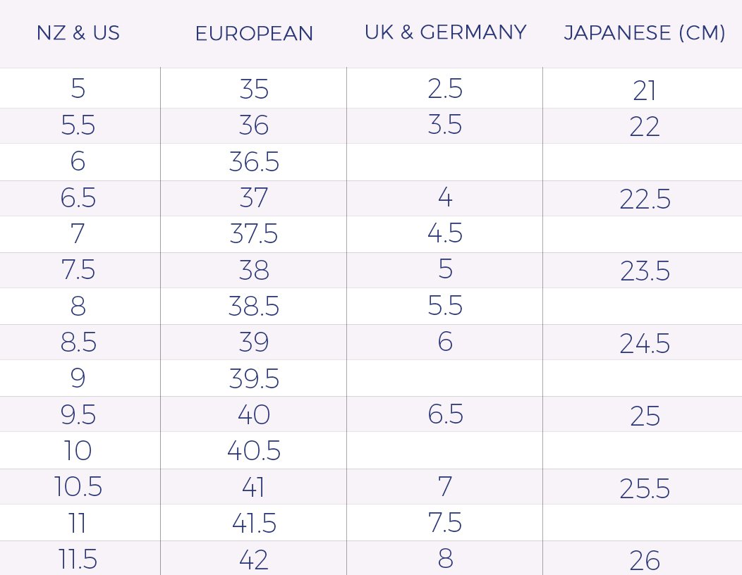 A good starting point to determine your size is to take a look at our size guide, this will help you navigate the difference between NZ/AUS, European and UK sizing. If you still require some more clarity, we have a Blog article here all about finding the right fit including some helpful tips on how to measure your foot.