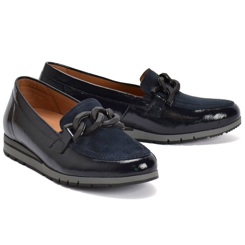 Low heel platform wedge leather slip on shoe with decorative inter-woven chain trim detail, removable insoles and twin elastic gussets for the ideal fit. This style is a Gabor 'G' generous width fitting with extra volume in the toes, ball and instep areas to provide the foot with the room it needs.