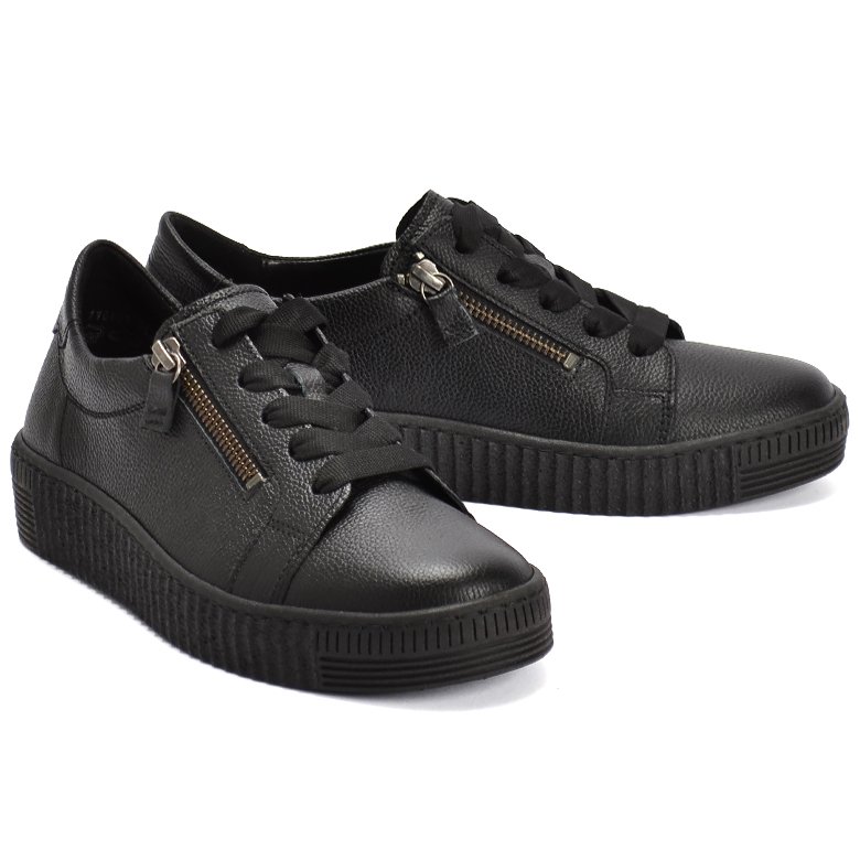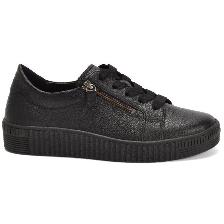 Leather lace up sneaker with removable insoles and convenient twin zips for easy accessibility.