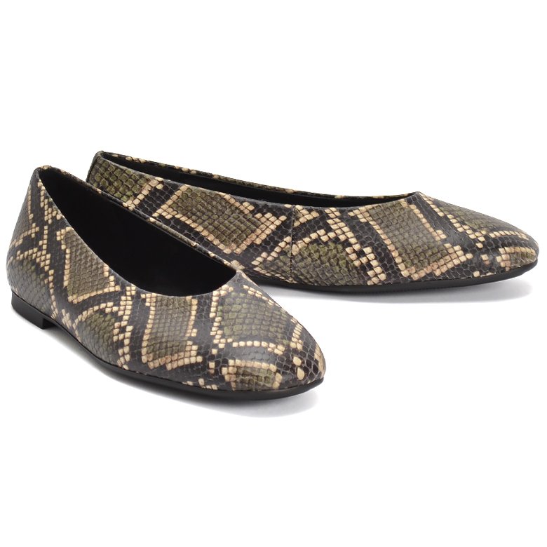 Low heel slip on printed snakeskin-effect leather shoe with rounded square toe.