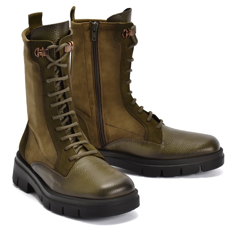 Low heel multi leather and stretch velour textile platform lace-up midi length boot. Features convenient inside zip for ease of entry, supportive and comfortable lug sole, and TRIFLOW cushioning technology. The stretch textile upper ensures ideal ankle and calf fitting.