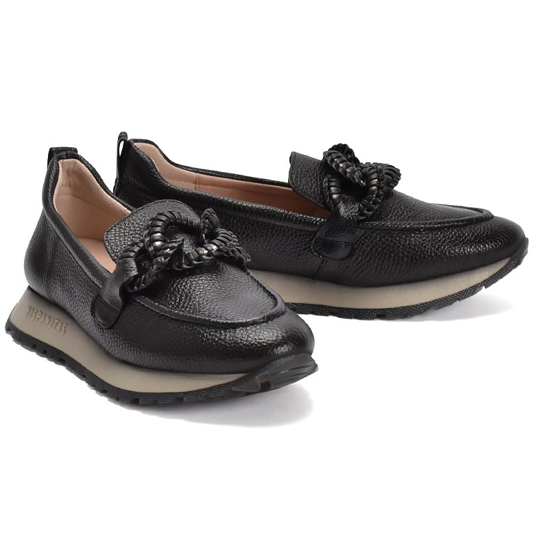 Slip-on leather loafer style shoe with chic hand-braided inter-link chain trim detail and removable insoles that can be replaced with an orthotic.