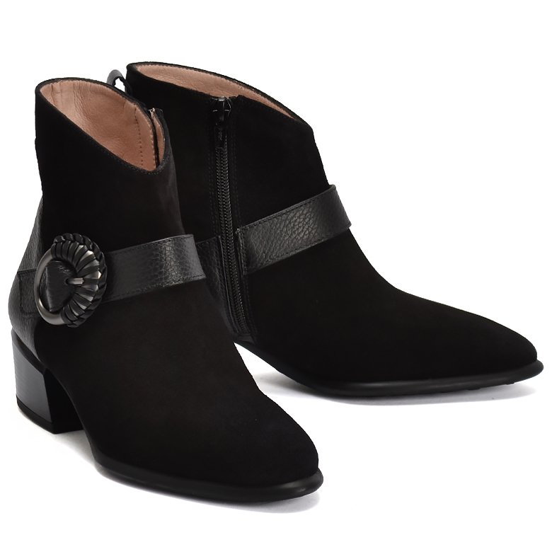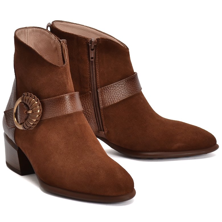 Low heel multi leather ankle boot with decorative hand-braided buckle detailing, tapered toe and flattering V-front ankle cut. Features soft suede leather on front, grain leather on back and convenient inside zip and pull tab for ease of entry.
