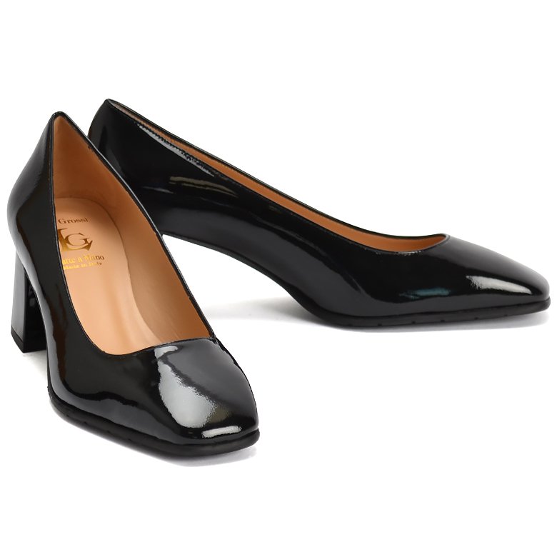 Mid block heel patent leather dress court shoe featuring soft square toe and full leather lining.