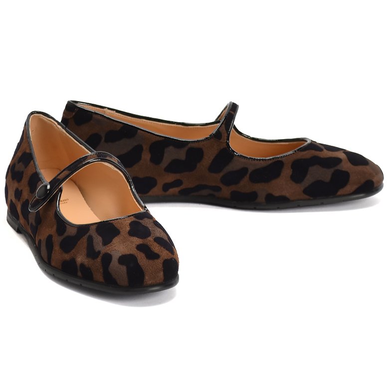 Low heel slip-on suede leather ballet flat with a decorative elasticated strap. The leopard print design features elegant flocked velveteen finish on the suede leather.