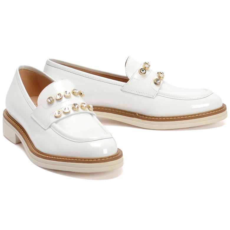 Low heel patent leather loafer styled shoe featuring elegant diamante trim and side stitched detailing.