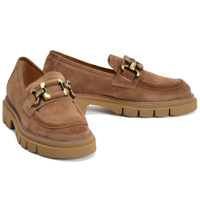 Low heel platform suede leather slip-on loafer style shoe with a decorative antique-brass toned buckle detail and side stitched detailing.