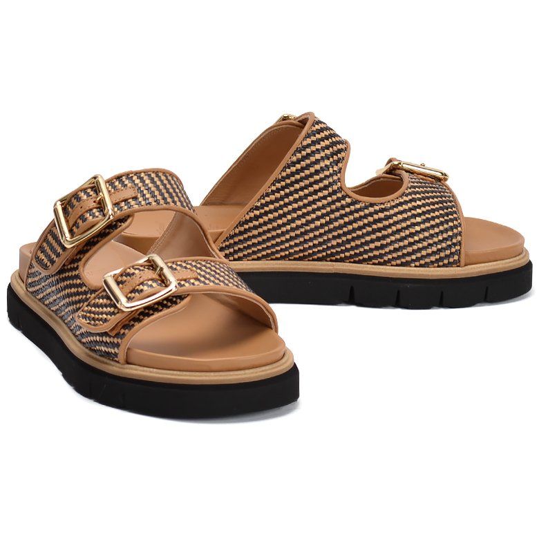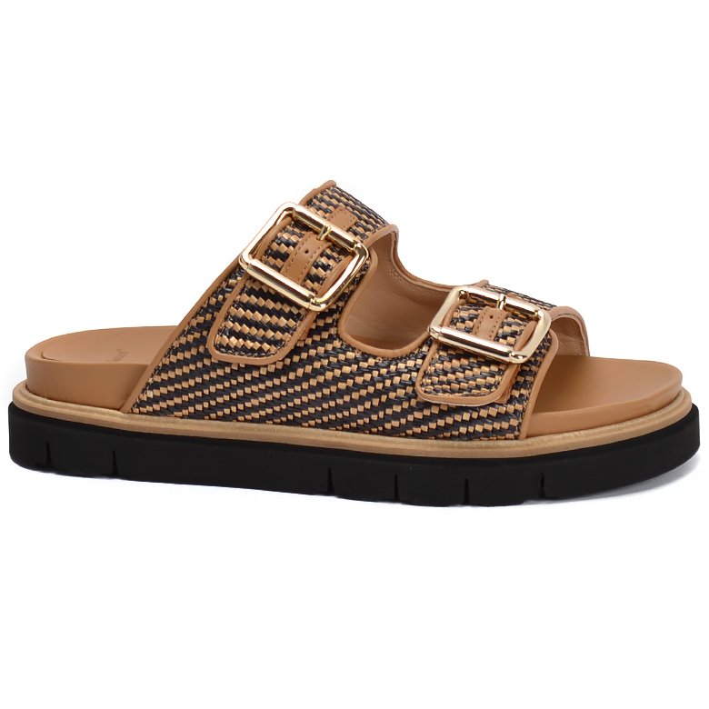 Slip-on platform wedge woven textile sandal with leather trim and two buckle adjustments for the ideal fit.