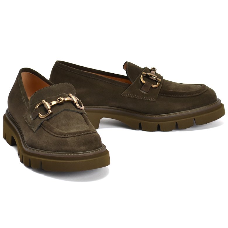 Low heel platform suede leather slip-on loafer style shoe with a decorative brushed gold coloured buckle detail and side stitched detailing.