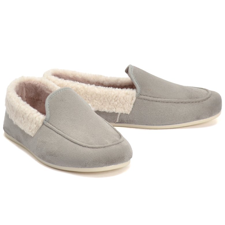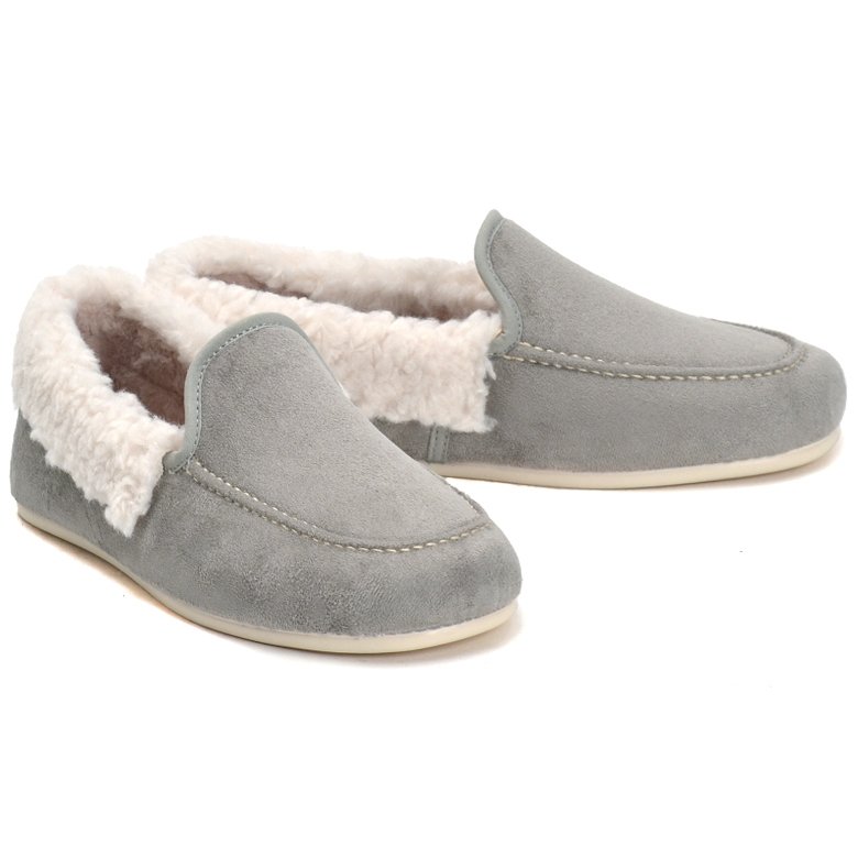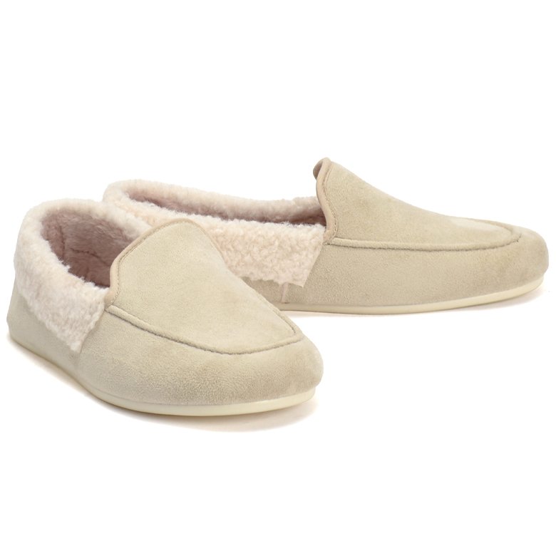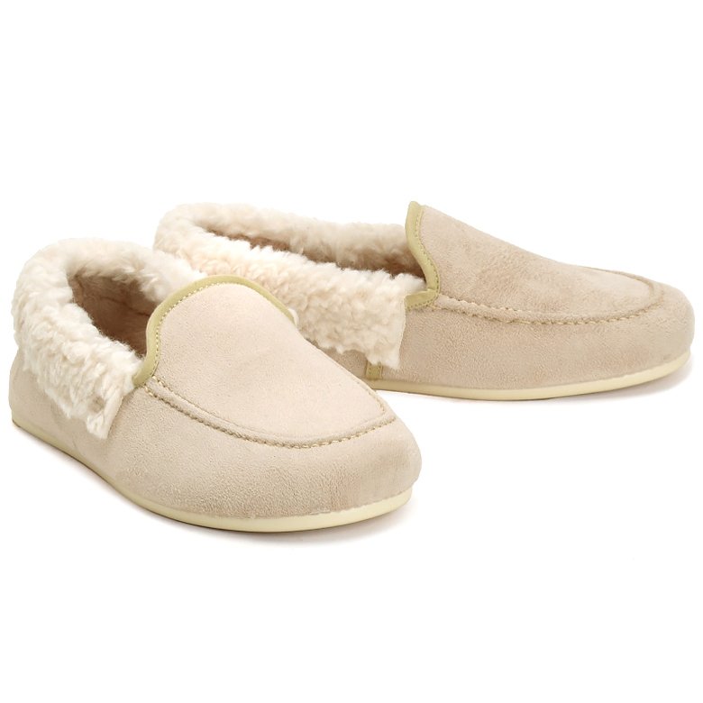Slip on man-made textile slipper with soft fleece textile lining. Features fluffy collar, removable insoles that can be handwashed and durable soles.