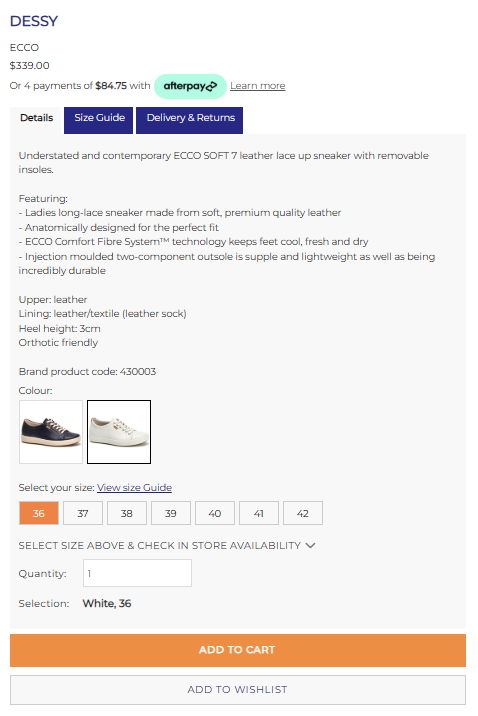 Like it? Choose the colour and size and then click 'ADD TO CART'. You can remove the style later if you change your mind. Notice the blue tabs - click these for sizing and delivery info.