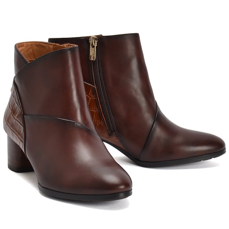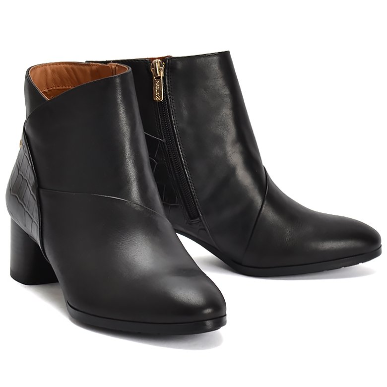 Mid-height block heel leather ankle boot featuring a convenient inside zip for ease of entry. Features a leather sock with cushioned insole for extra comfort, and a soft low pile velour-like textile lining. This style features croc-embossed leather detailing and has a neat ankle fit.