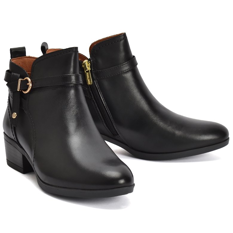 Low heel leather ankle boot with pull tab, inside zip for ease of entry and decorative leather strapping.