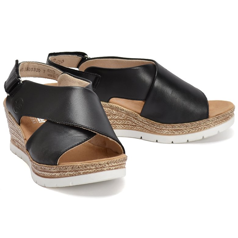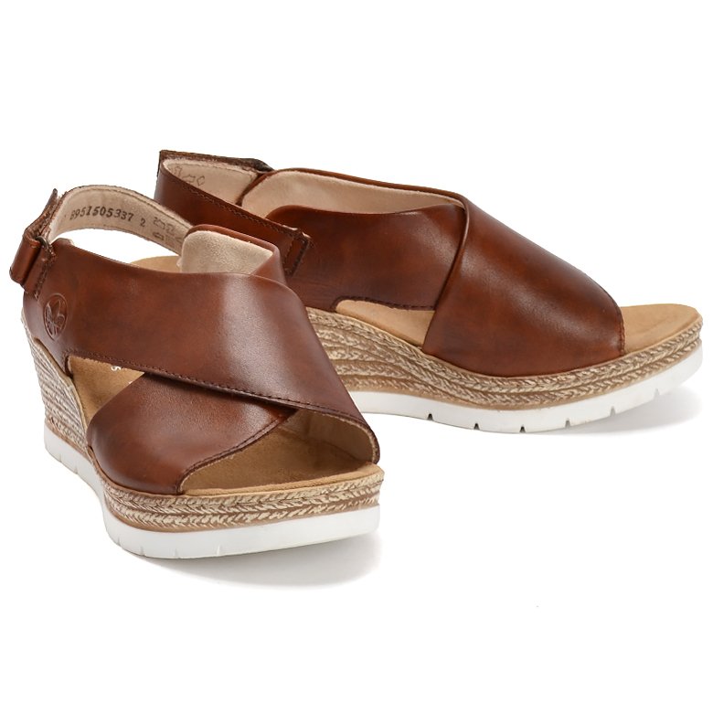 Mid heel platform wedge leather sandal featuring soft leather crossover straps and convenient velcro back strap for the ideal fit.