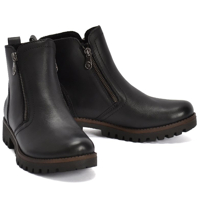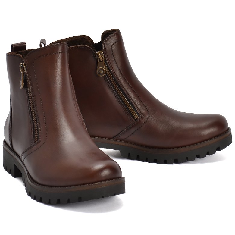 Low heel leather ankle boot featuring soft fleece textile lining, functional twin zips for ease of entry and a pull tab.