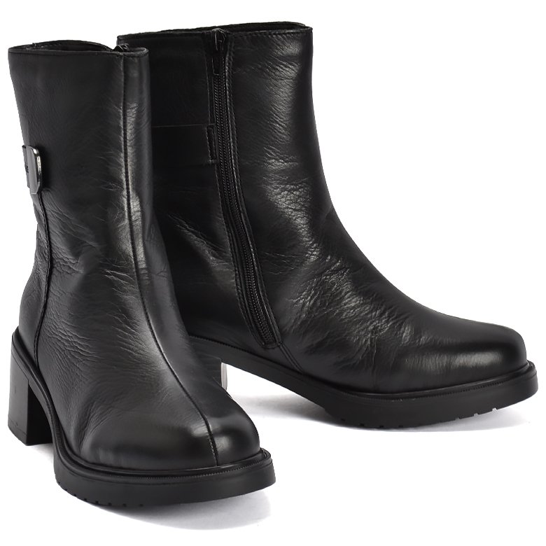 Mid block heel soft leather ankle boot featuring plush lambswool lining for added warmth and comfort and a convenient inside zip for ease of entry.