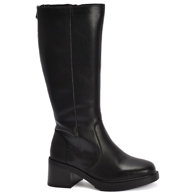 Mid block heel leather knee-length boot with a back zip with an extendable gusset for an adjustable calf width to accommodate a wider calf.