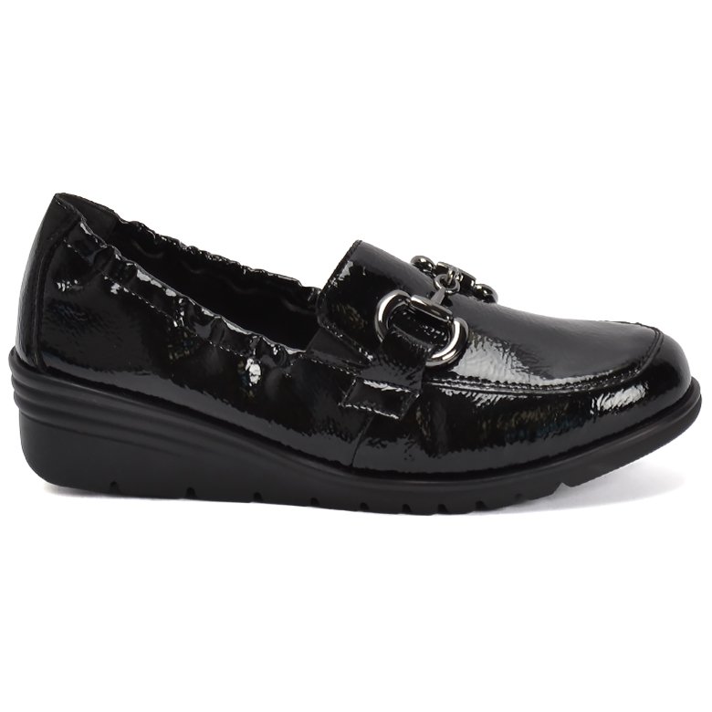 Low height wedge platform high shine patent leather slip-on shoe with twin elasticated gussets for the ideal fit.
