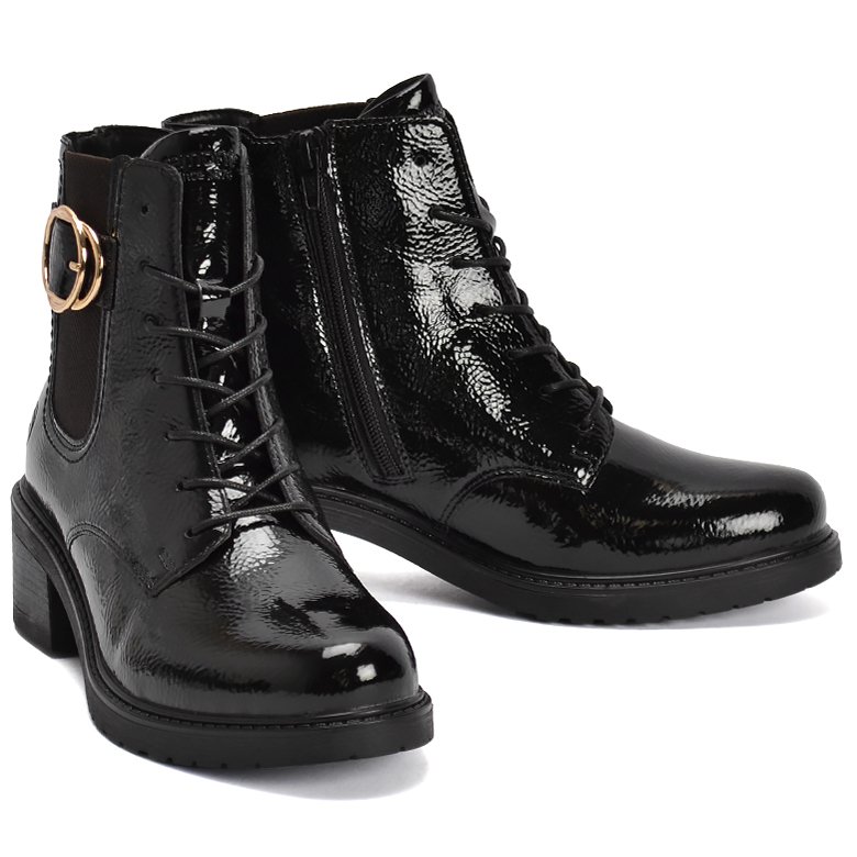 Mid block heel man-made lace-up patent ankle boot with a convenient inside zip for ease of entry and an elasticated side panel for the ideal fit.