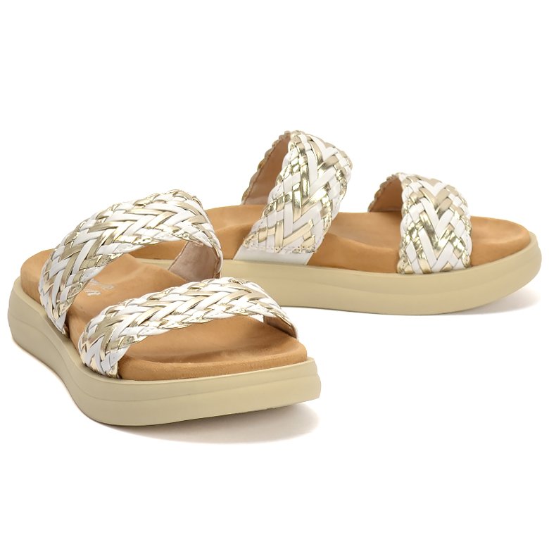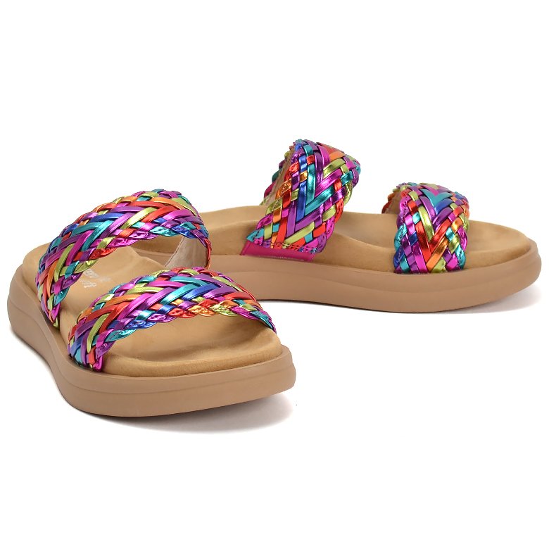 Low heel multicolured man-made and leather slip-on shoe featuring unique interlaced strap detailing and contoured footbed.