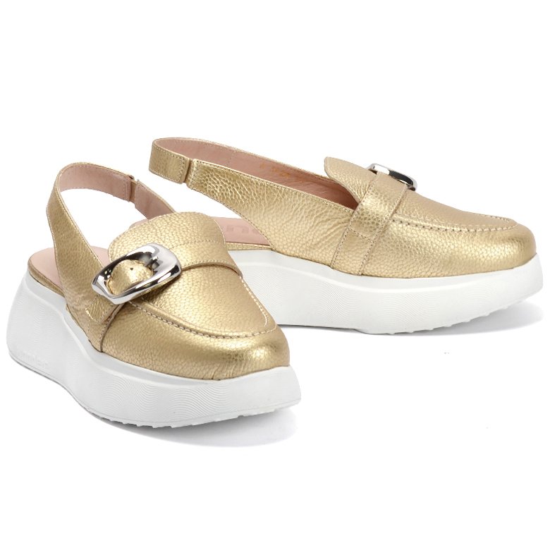 Mid height platform metallic leather sling-back loafer with decorative silver coloured buckle detail and elasticated back strap for the ideal fit.