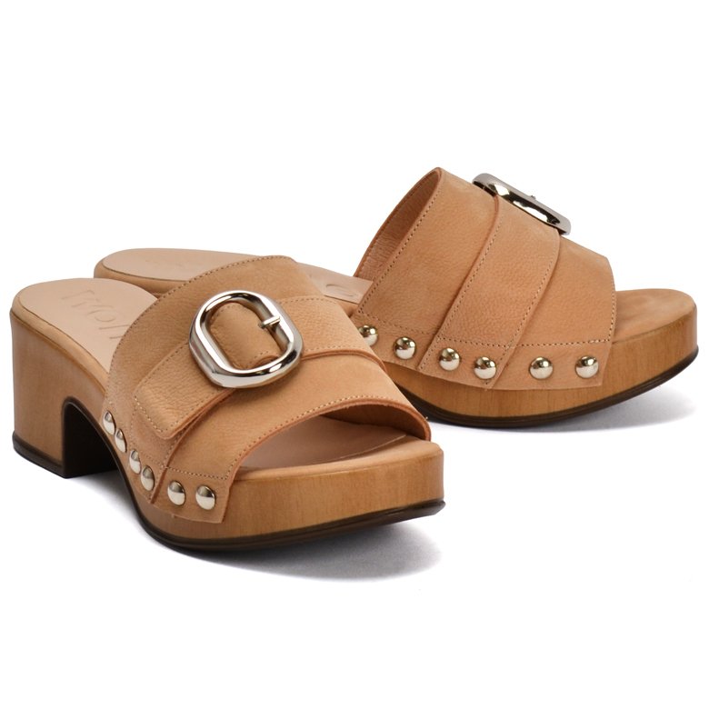 Mid-height clog style nubuck leather shoe featuring decorative buckle and wood-look platform veneer.