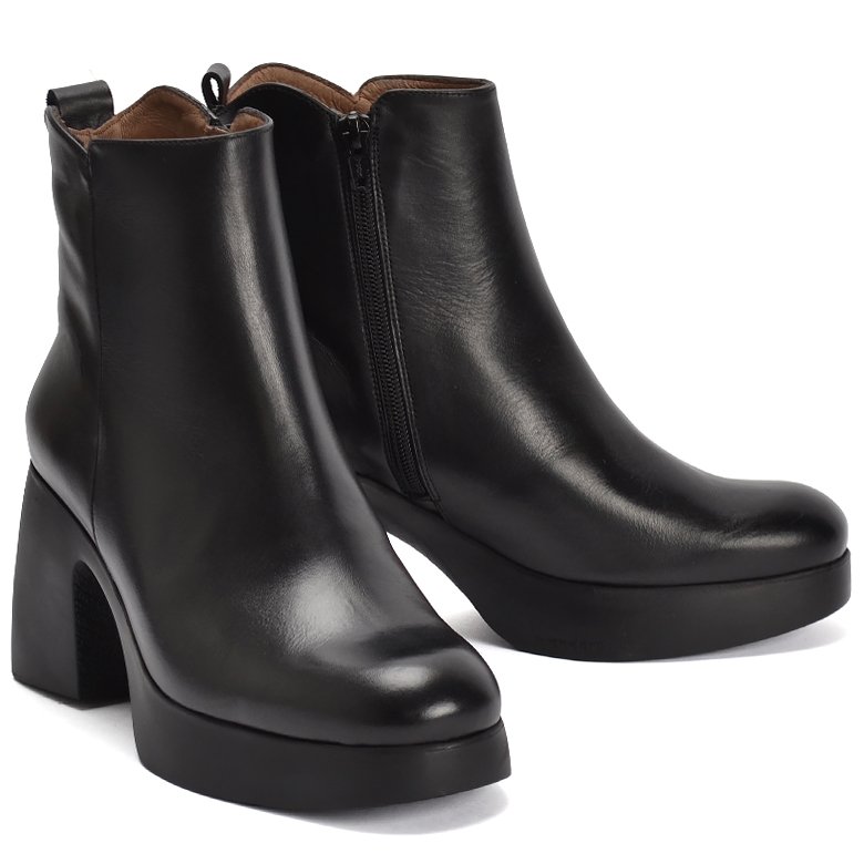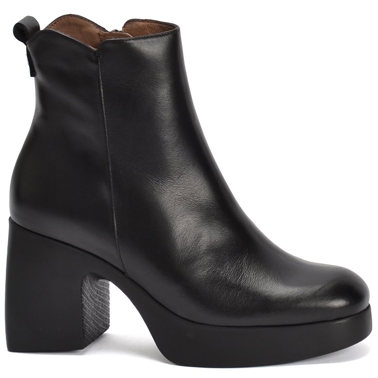 High block heel soft leather ankle boot featuring a convenient inside zip and pull tab for ease of entry and Wonders logo rivet on back of shoe.