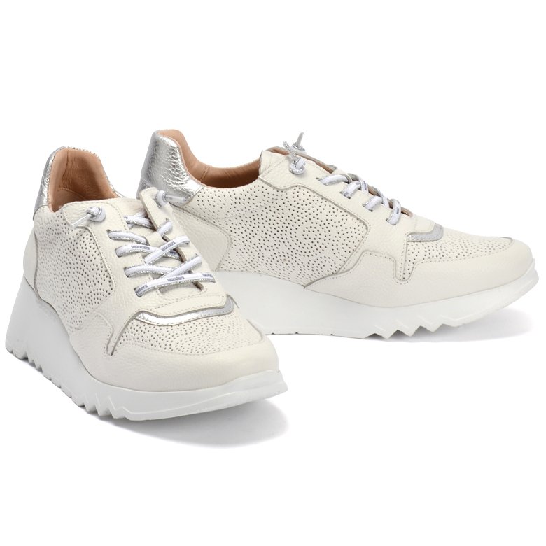 Platform wedge leather slip-on sneaker styled shoe featuring elasticated laces for ease of access and decorative perforated print detail. Featuring contrast metallic detailing on laces and on the back of shoe and a removable insole that can be replaced with an orthotic.
